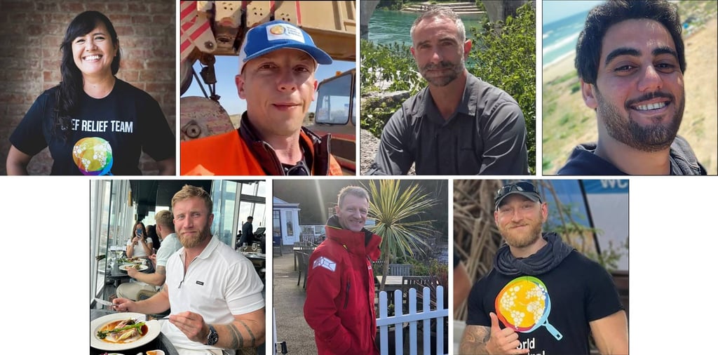 Нямаше незабавен отговор на молбата на Албанезе от Херцог, който посети националната столица Канбера в сряда, след като прекара два дни в Сидни, където утешаваше евреи, разтърсени от антисемитска атака в Бонди Бийч през декември което остави 15 мъртви. От горе вляво надясно: Lalzawmi Frankcom, Damian Sobol, James Kirby и Saifeddin Abutaha. Долу отляво надясно: Джеймс Хендерсън, Джон Чапман и Джейкъб Фликингер. Всичките седем хуманитарни работници бяха убити от израелска бомбардировка на 1 април 2024 г. Снимка: World Central Kitchen/AFP
