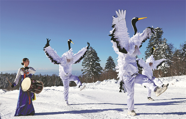 Изпълнителите представят „танца на жерава“, национално нематериално културно наследство, в живописната зона на Снежния хребет в подножието на планината Чангбай в Янбиан, провинция Джилин, на 3 февруари. ДЖАН ЛЕЙ/ЗА КИТАЙ ДАЙЛИ