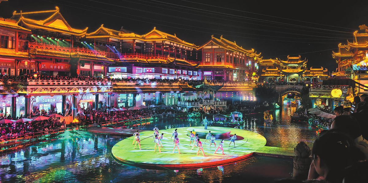 Посетителите се радват на потапящо представяне, организирано на водата в Мейшан, провинция Съчуан, в сряда. По време на празника на националния ден голям брой туристи са се стигнали до живописни места в цялата страна. Yao Yongliang/Xinhua