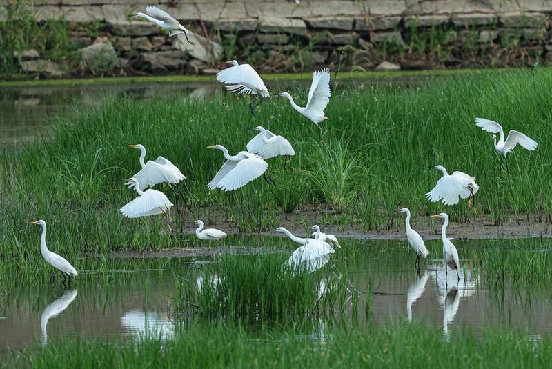 Естерките и чапли на жълто се почиват и се хранят във водите на влажна зона в град Ронченг, провинция Шандонг в Източен Китай, на 11 август 2025 г. [Photo/Xinhua]