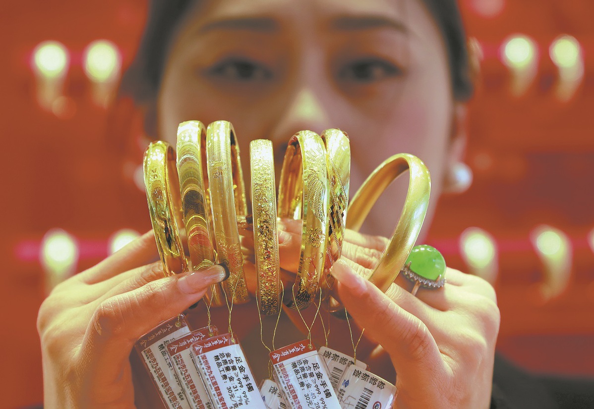 Продавачка демонстрира златни бижута в магазин в Мендзи, провинция Юнан, на 21 януари. XUE YINGYING/ЗА КИТАЙ ДАЙЛИ