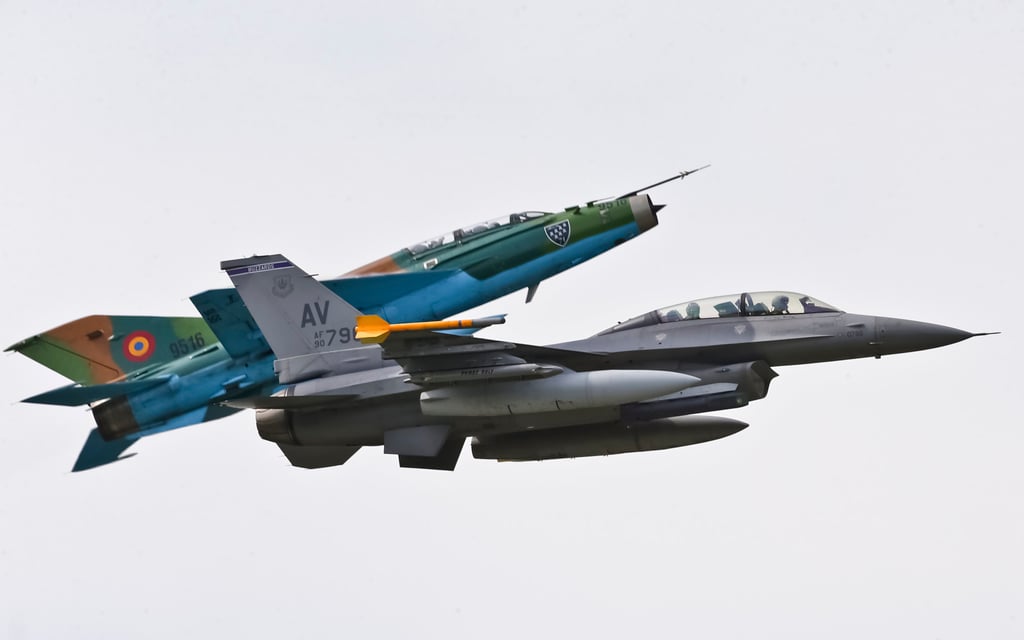 Руснак, направен MIG 21 изтребители на джет маневри до американски ВВС F-16 по време на военно упражнение в Румъния през 2014 г. Снимка: AP