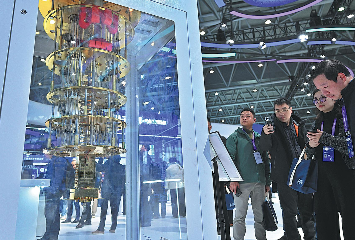 Посетителите изучават свръхпроводящ квантов компютър на конференцията за квантови технологии и индустрия 2025 в Хефей, провинция Анхуей, на 20 ноември. КИТАЙ ДАЙЛИ
