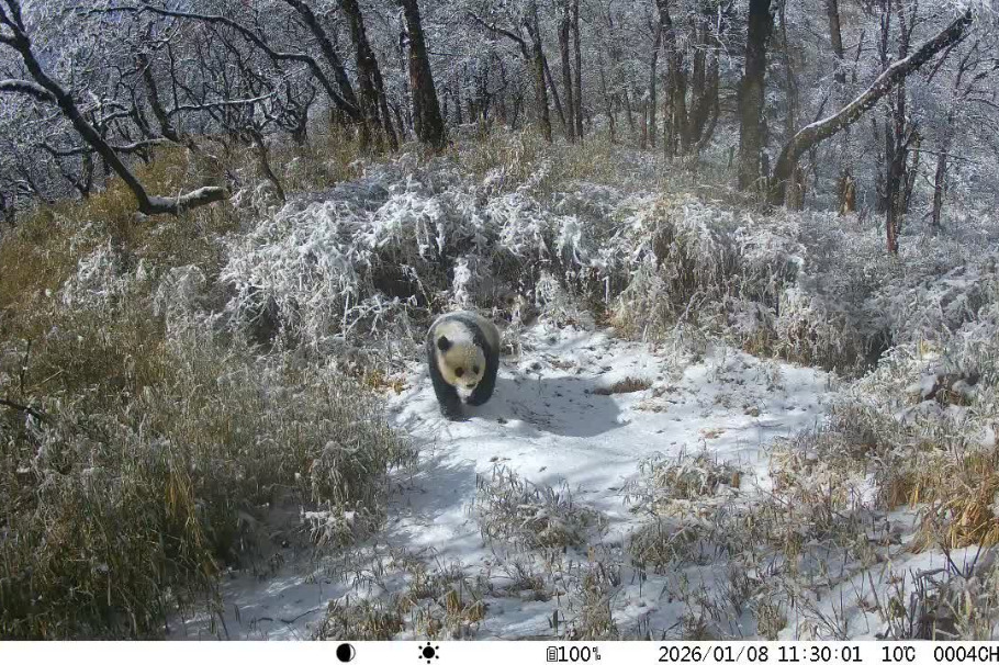 Инфрачервена камера, разположена на надморска височина от около 2800 метра, засне редки кадри в четвъртък на дива майка-гигантска панда и нейното малко, които се разхождат спокойно през снега в района на Чунджоу на Националния парк на големите панди в провинция Съчуан.