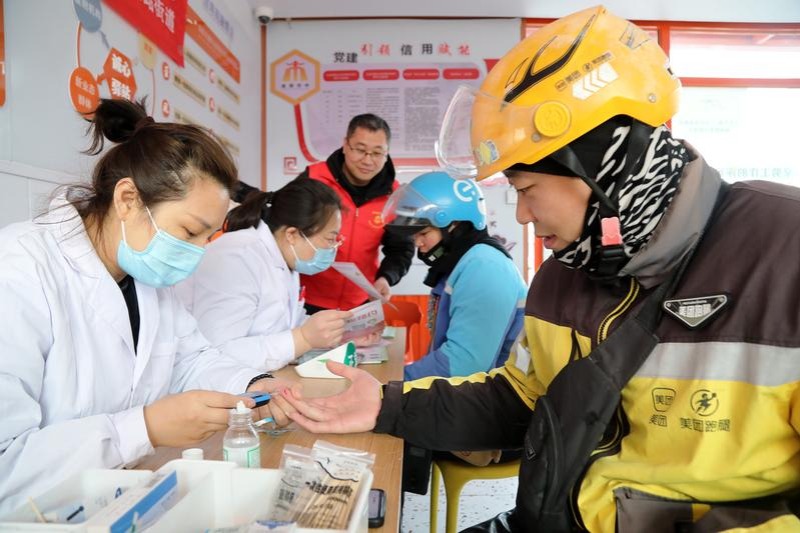 Доброволци осигуряват безплатни измервания на кръвната захар в област Shizhong, Zaozhuang, провинция Shandong, на 5 март 2025 г. [Photo/Xinhua]