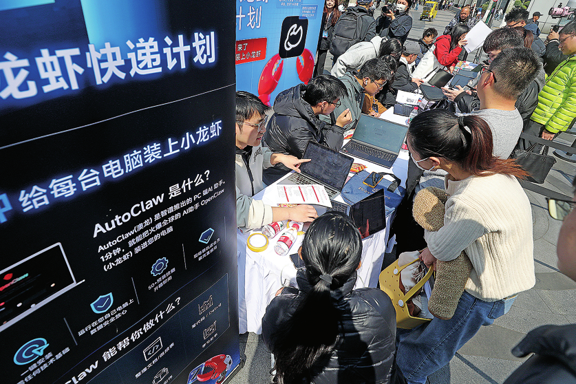 Доброволци в Hangzhou, провинция Zhejiang, учат местните жители в сряда как да използват Open-Claw, автономен AI агент с отворен код, който използва големи езикови модели за изпълнение на ежедневни задачи. LIN YUNLONG/ЗА КИТАЙ ДАЙЛИ