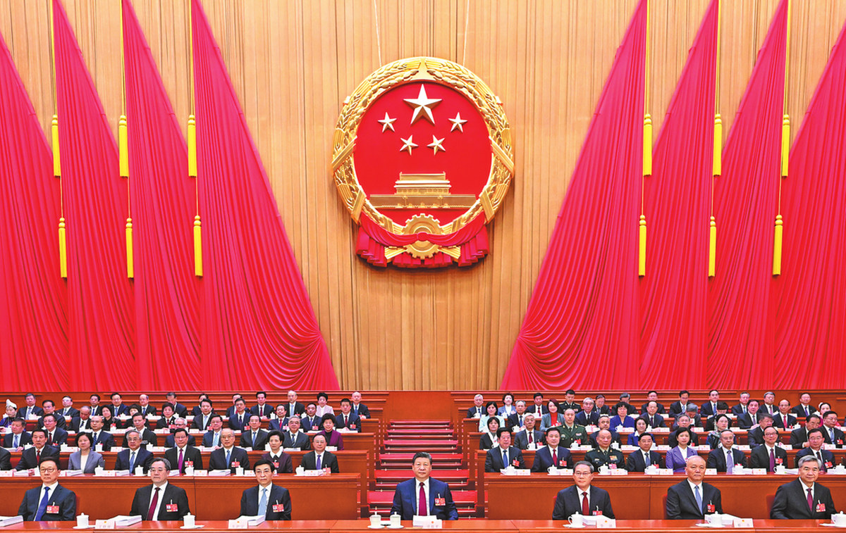 Президентът Си Дзинпин (в средата), който е и генерален секретар на Централния комитет на Комунистическата партия на Китай и председател на Централната военна комисия, и други лидери присъстват на срещата по откриването в четвъртък на четвъртата сесия на 14-ия Национален народен конгрес, най-висшият законодателен орган на Китай, в Голямата зала на народа в Пекин. Xie Huanchi/Xinhua