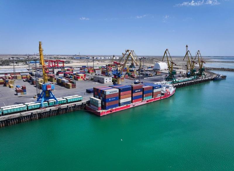 Снимка с дрон, направена на 6 август 2025 г., показва товарен кораб, акостирал на пристанище Актау, Казахстан. [Photo/Xinhua]