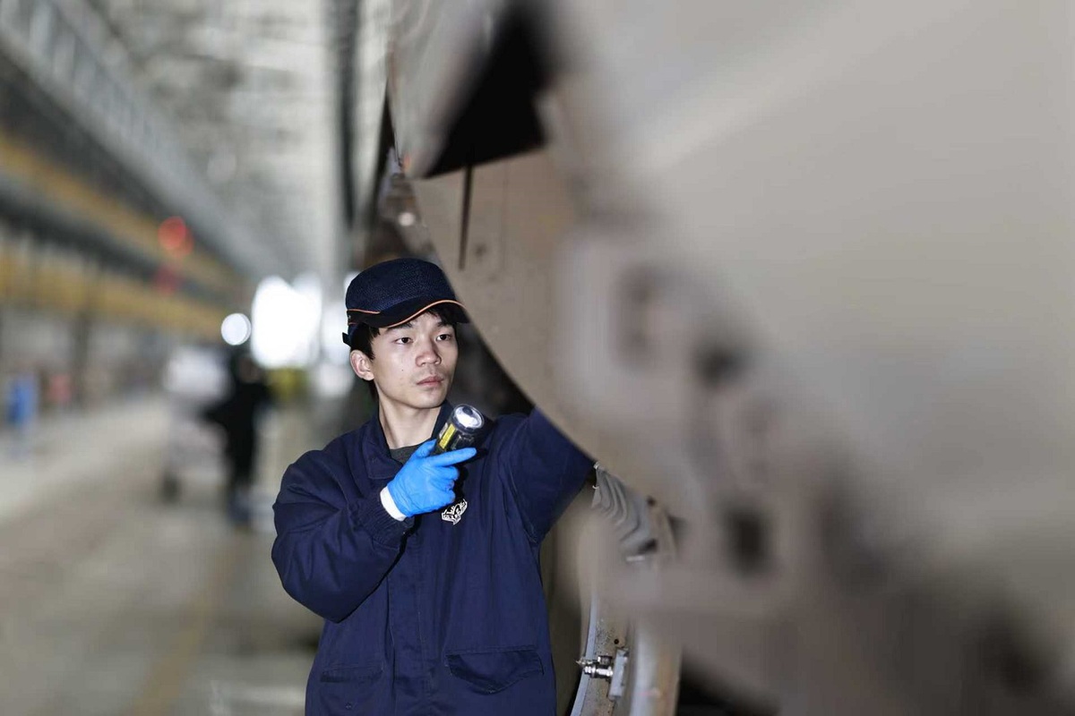 Ши Гаохуа, млад механик в Chongqing West EMU Depot на China Railway Chengdu Bureau Co Ltd, извършва проверка на влак-стрела в Чунцин на 3 февруари 2026 г. [Photo by Su Zhigang/For chinadaily.com.cn]