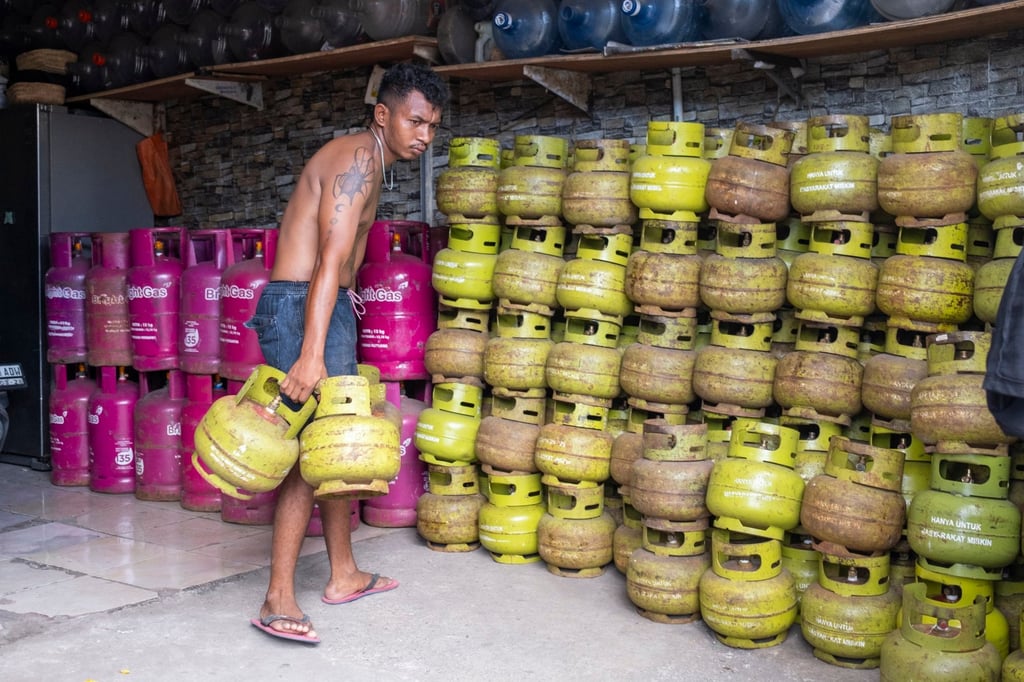 Мъж сортира бутилки за готвене с втечнен нефтен газ (LPG) в магазина си в Индонезия в понеделник. Цените на тубите с пропан-бутан от 12 кг бяха повишени в Джакарта, Източна Ява и Централна Ява. Снимка: EPA