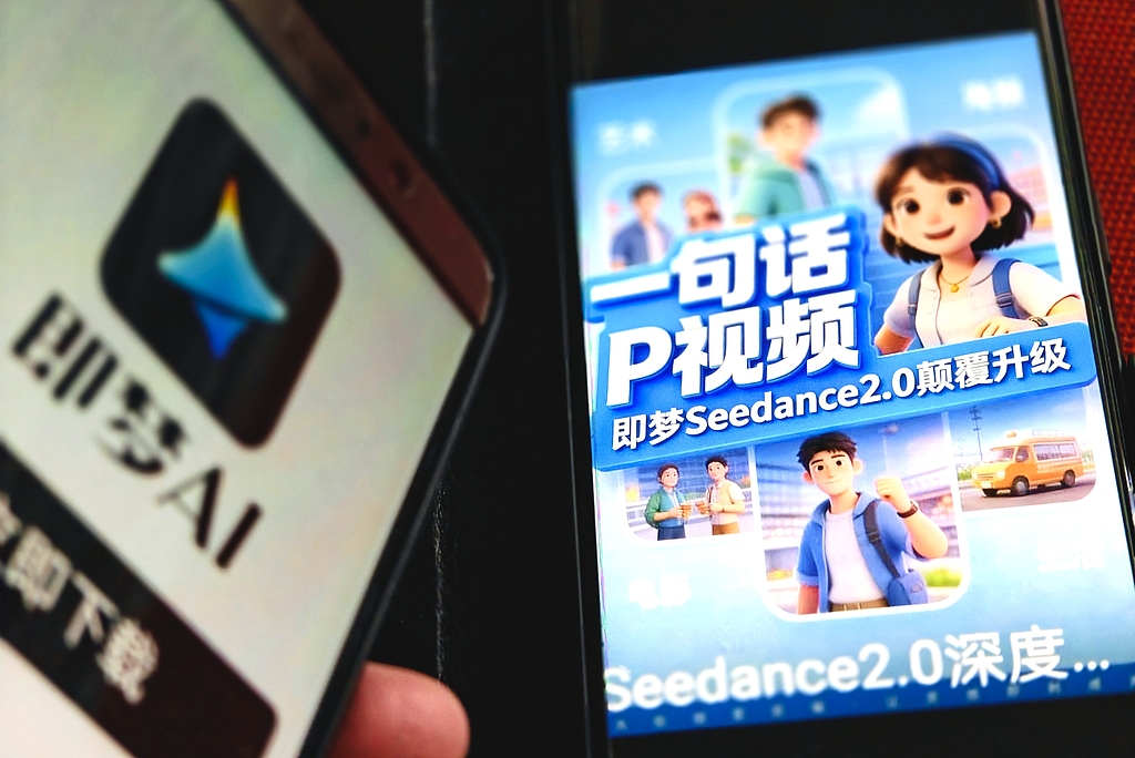 Лого на инструмента за изкуствен интелект на ByteDance Dreamina и плакат на неговия видео модел Seedance 2.0 са показани на мобилен телефон на 9 февруари 2026 г. [Photo/VCG]