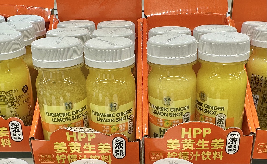 В магазините, управлявани от Hema Fresh, напитките на базата на куркума и джинджифил са осигурили място заедно със соковете и функционалните напитки в хладилни витрини. Обработена под високо налягане куркума-джинджифил-лимон е на цена от 8,9 юана (1,25 долара).