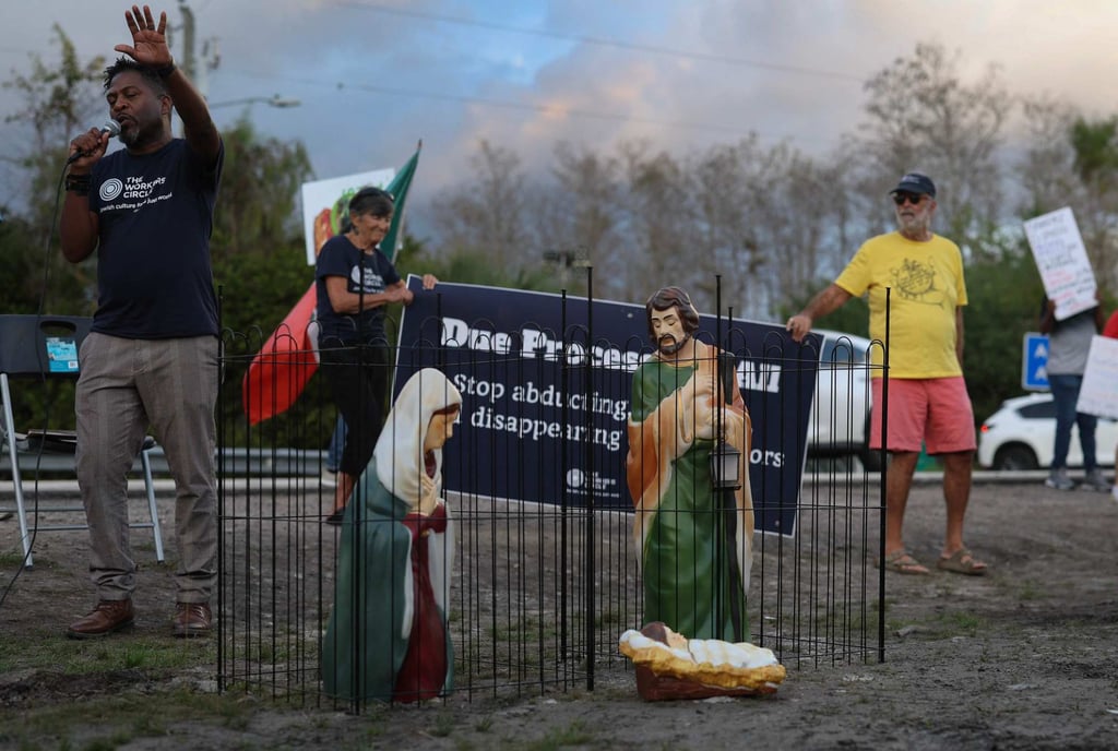 Сцена на Рождество Христово, изобразяваща раждането на Исус Христос, включваща Мария и Йосиф в клетки, докато са държани в ареста, седи близо до входа на „Алигатор Алкатраз“ в Очопи, Флорида, на 21 декември. Снимка: AFP