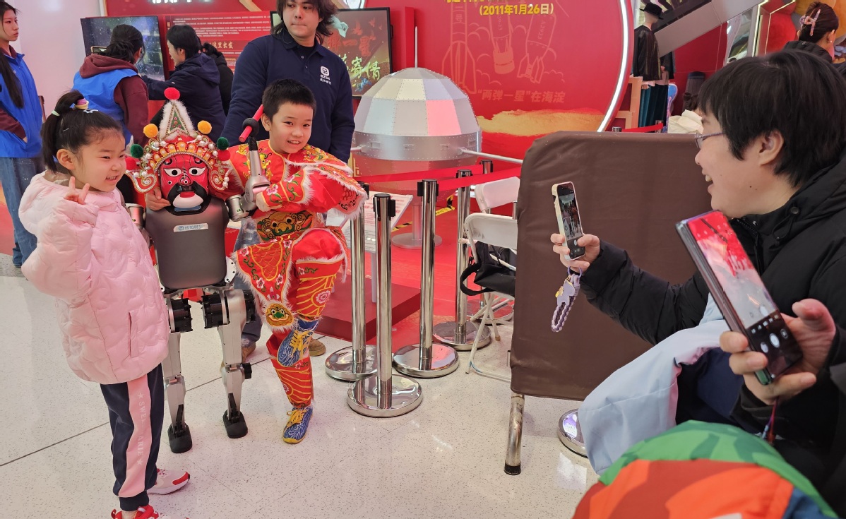 Деца позират за снимки с робот на панаир в храма на науката и технологиите на Пролетния фестивал в Пекин в четвъртък. [Photo by Geng Feifei/chinadaily.com.cn]