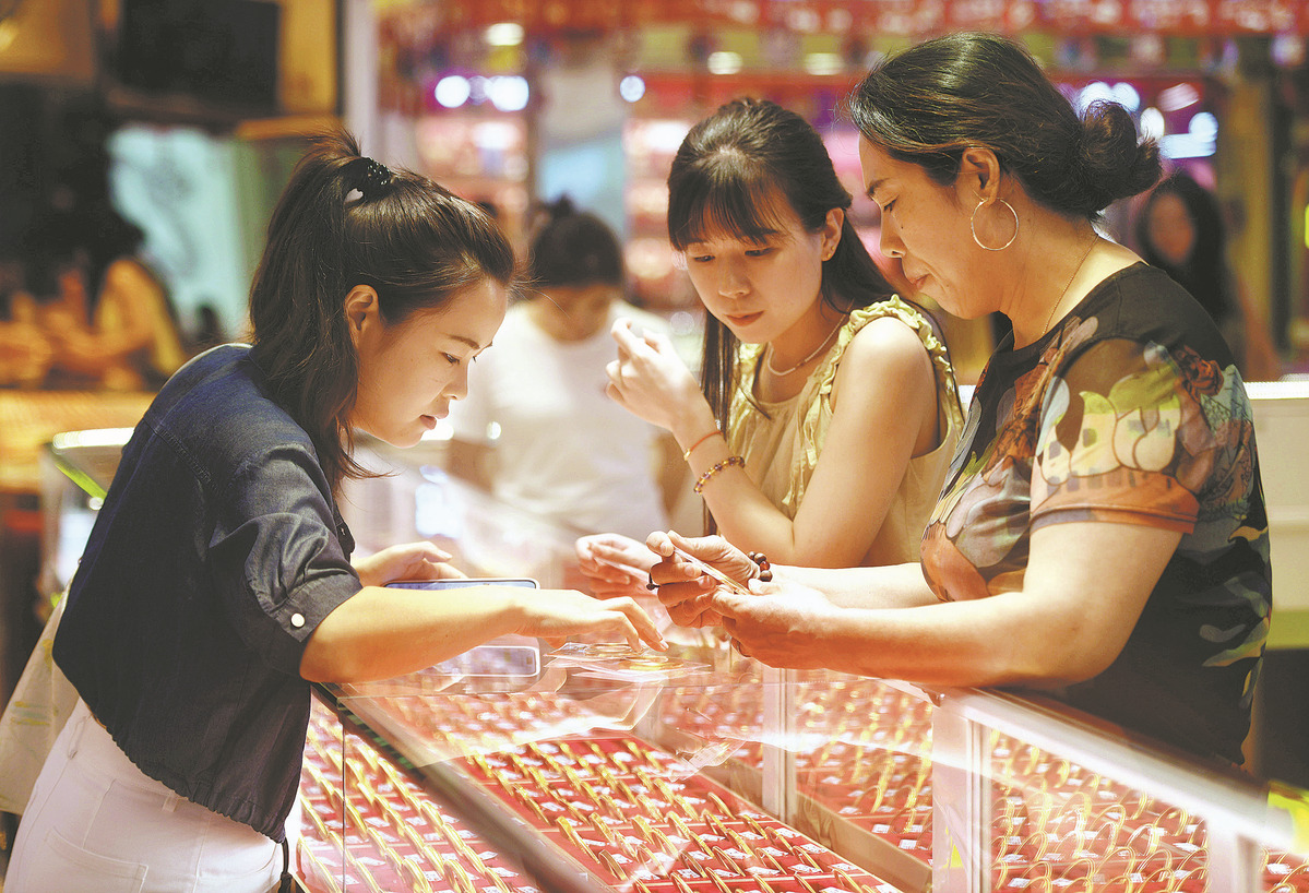 Потребителите проверяват златни аксесоари в магазин в Hangzhou, провинция Zhejiang, в сряда. LONG WEI/ЗА КИТАЙ ЕЖЕДНЕВНО