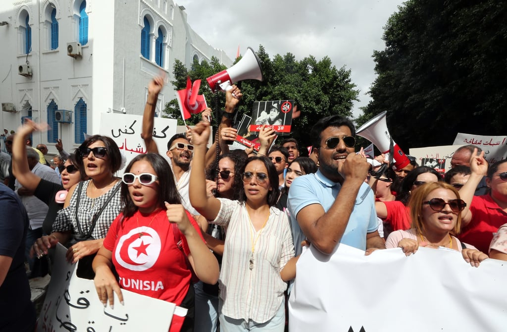 Привържениците на Свободната дестарийска партия на Тунис викат лозунги по време на протест срещу тунизийския президент Кайс Саид в Тунис през септември 2024 г. Снимка: EPA-Efe