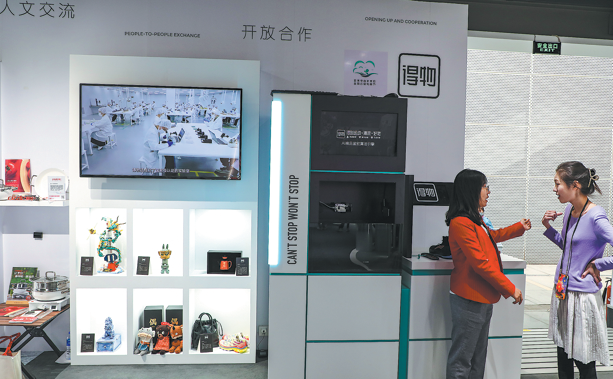 Делегати разговарят в изложбената зона на Dewu по време на 6th China International Import Expo в Шанхай на 8 ноември 2023 г. CHINA DAILY