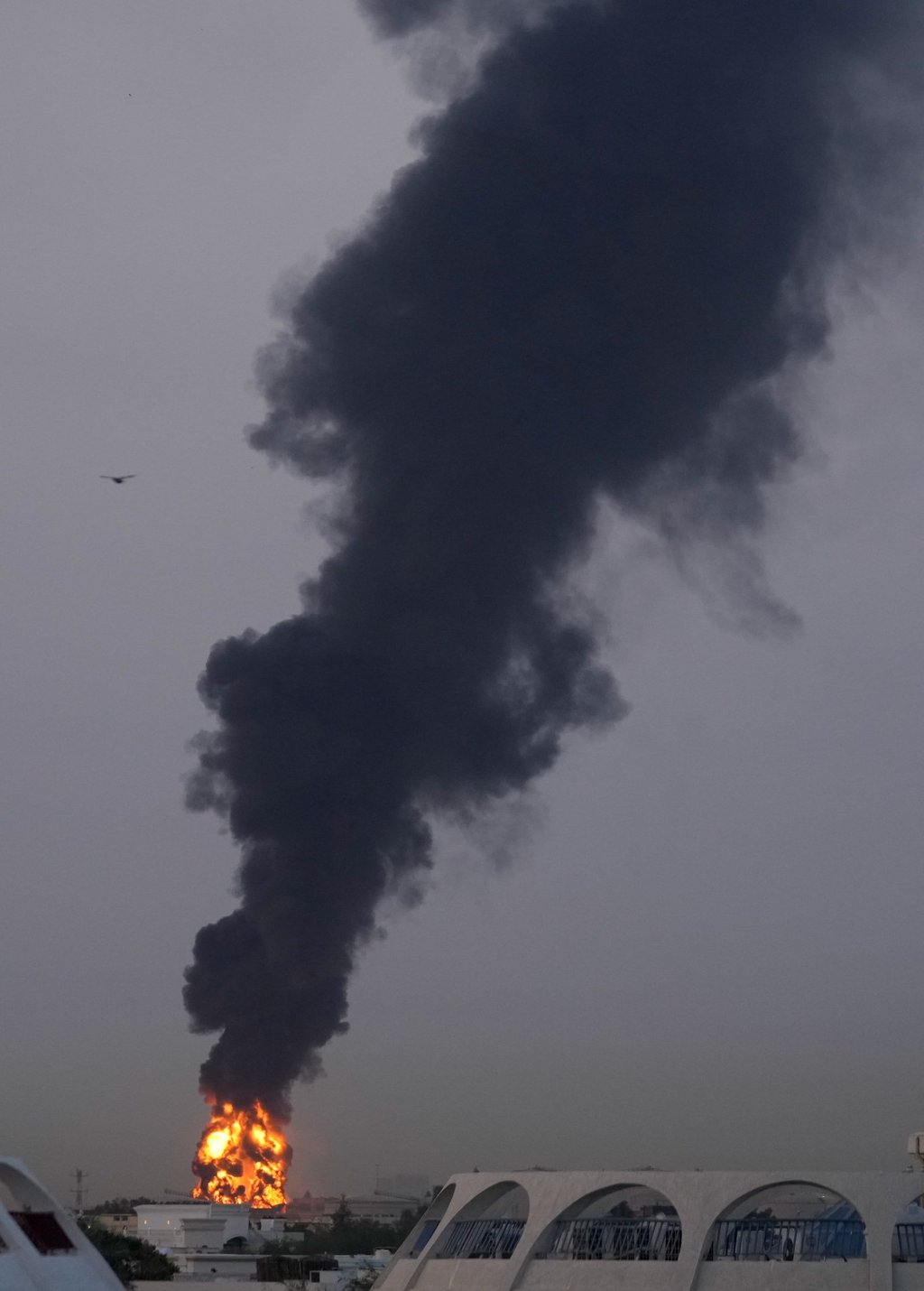 Полети, напускащи Обединени арабски емирства показват много различен модел, тъй като много хора напускат града с намаления брой налични самолети. След това Emirates връща самолетите обратно в своя център с ниска заетост. Стълбове дим се издигат, след като дрон подпали резервоар за гориво, налагайки временно спиране на полетите близо до международното летище в Дубай в понеделник. Снимка: AP