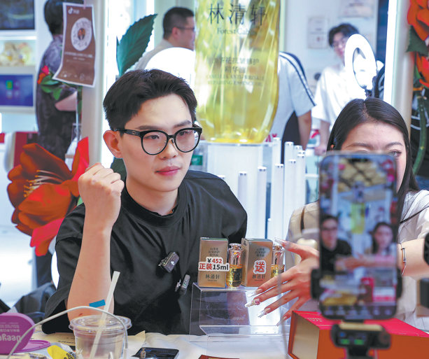 Търговците рекламират продуктите на Lin Qingxuan чрез предаване на живо в Шанхай на 14 май. CHINA DAILY