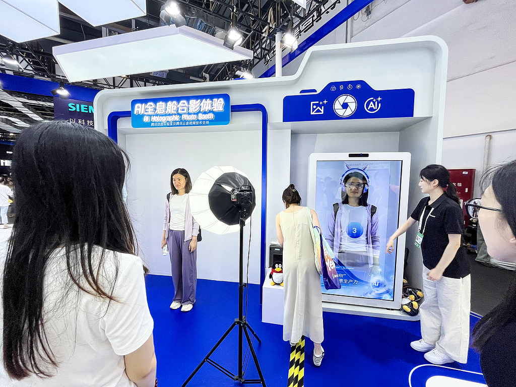 Участниците позират за снимки в AI холографска фото кабина на щанда на Tencent на Световната конференция за изкуствен интелект през 2025 г. в Шанхай на 27 юли 2025 г. [Photo/VCG]